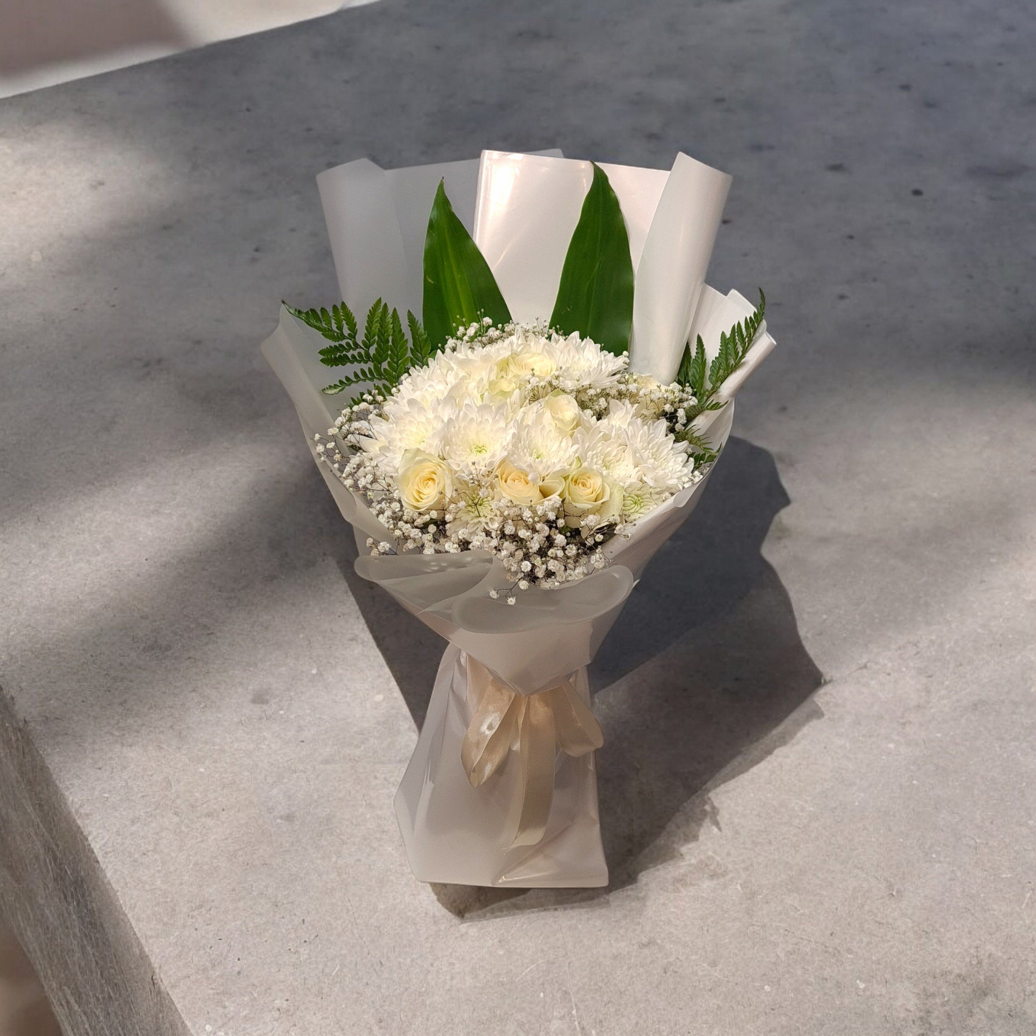 باقة من الورد الجوري الابيض لمحبين البياض المريح للنظر وتغليف ابيض