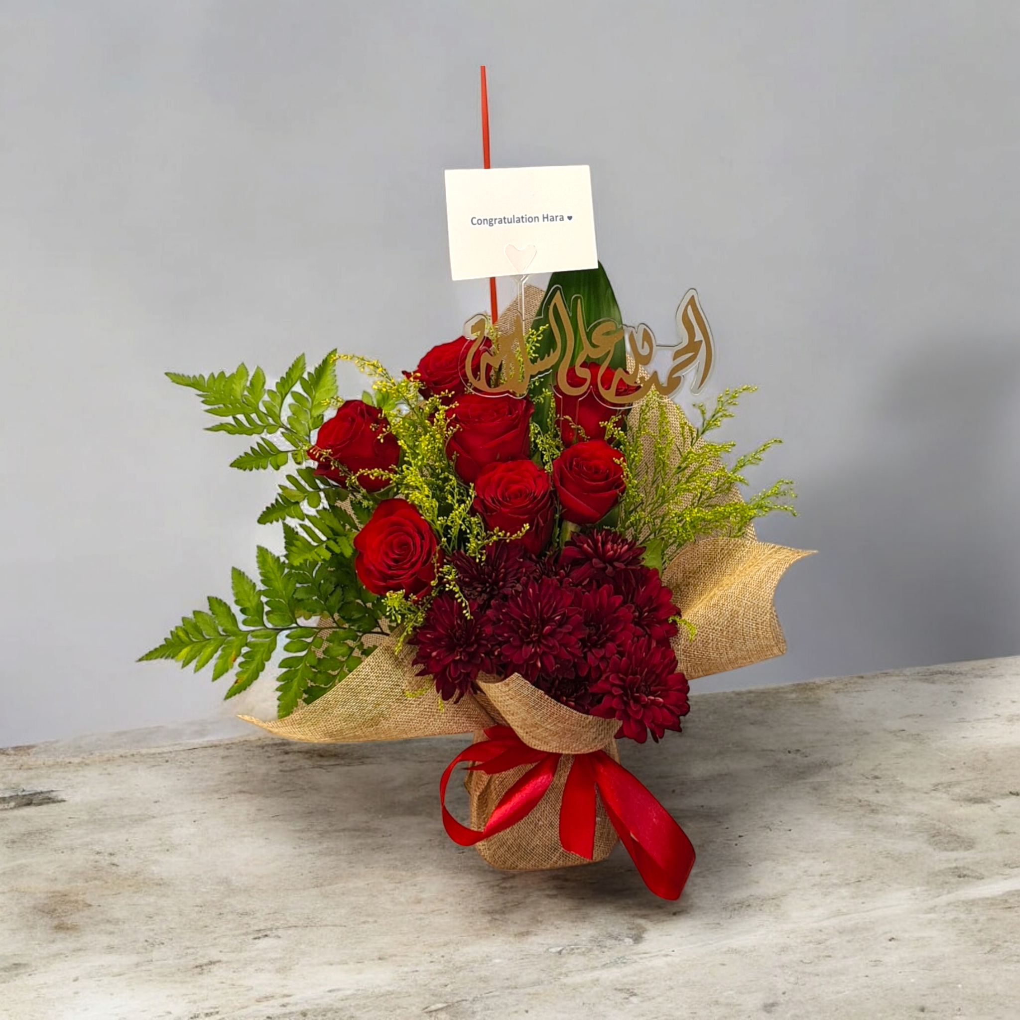 باقة من زهرة الجوري والكريز والسولداقو والاكسسوارات بتغليف خيش