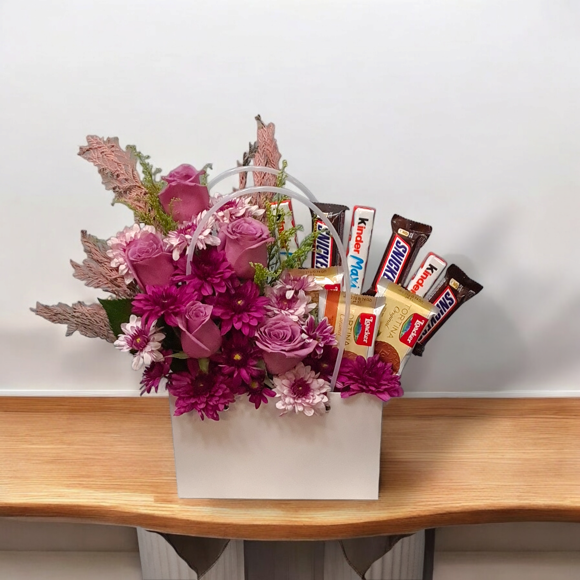 كيس من شكلاتة متنوعة مع زهور طبيعية