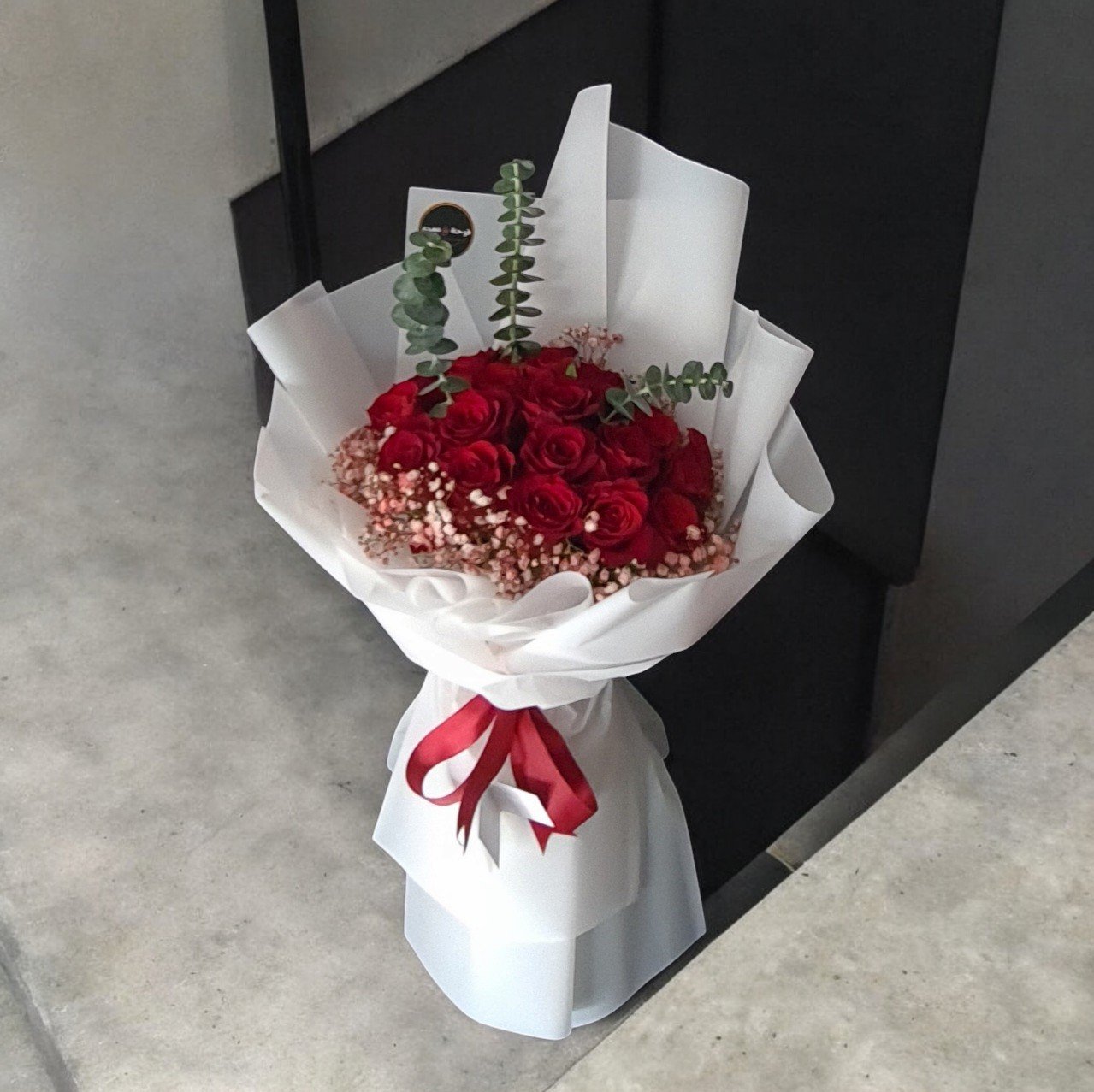 باقة من الورد الجوري الأحمر والجبسو فيليا الأحمر والأوكالبتوس