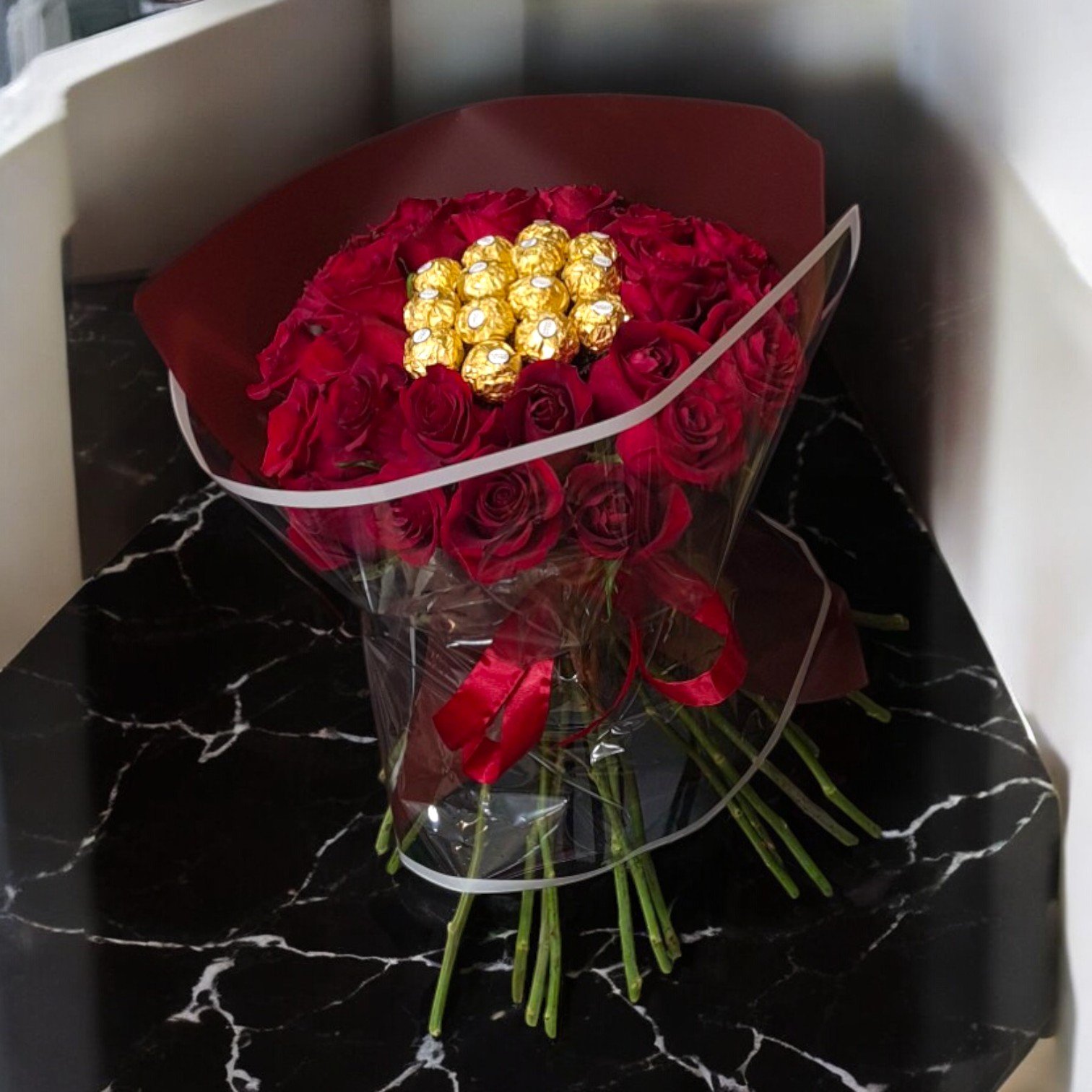 باقة ورد من شكلاتة روشية مع الجوري بتغليف انيق و ناعم