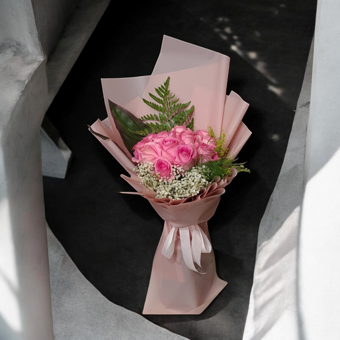 باقة من زهرة الجبسوفيليا والجوري البنك والاكسسورات الخضراء