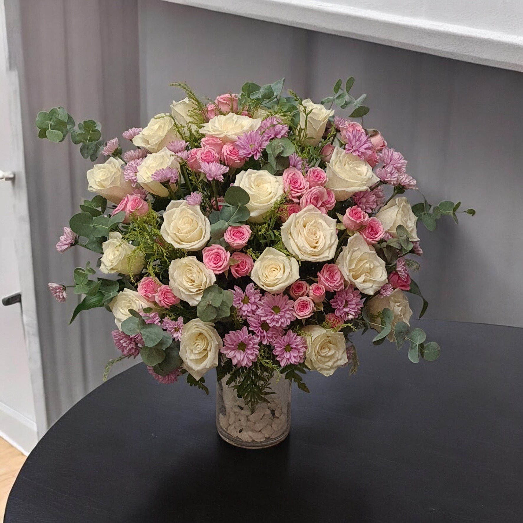 باقة من الزهور المتنوعة والاكسسوارات المميزة ( قد تتغير بعض الألوان والزهور حسب المواسم )