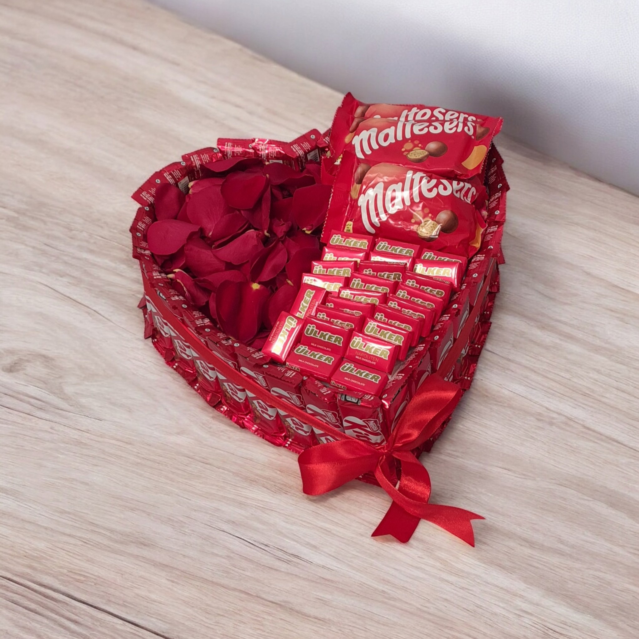 بوكس من الشكلاته الظاهره بالصورة فقط مع بتلات الورد