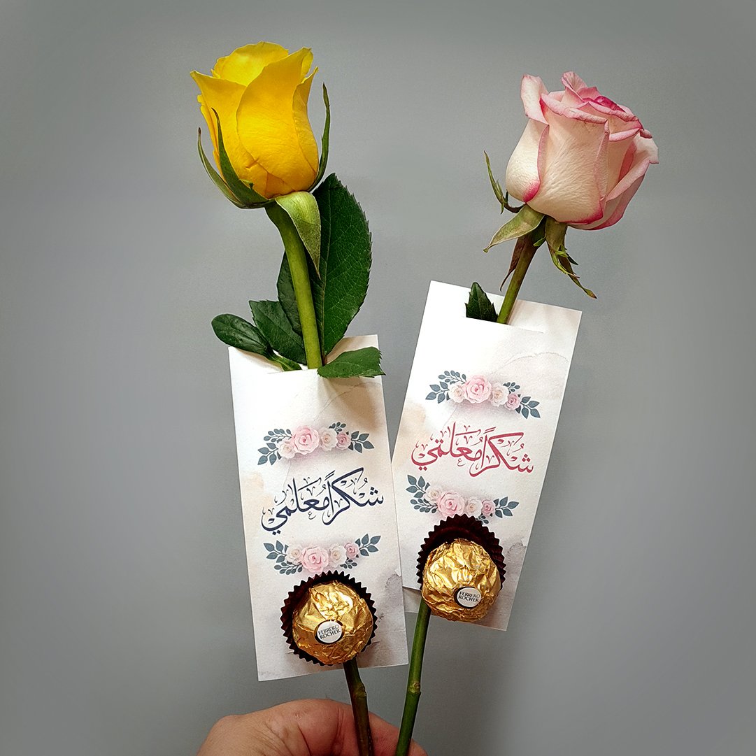 وردة جورية ( حبة ورد واحدة ) مع كرت شكرا معلمي\تي مع شكلاتة فريروروشة