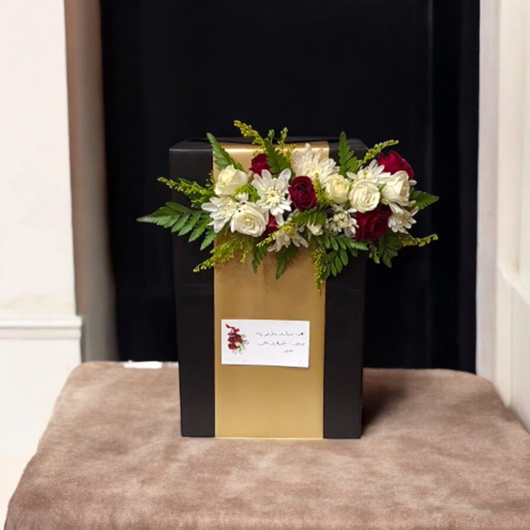 بوكس كرتون متوسط الحجم فارغ مع تنسيقة زهور طبيعية لتضيف هديتك بالداخل